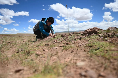 申添毅在查看岩石特征。(新华社记者 张龙摄)