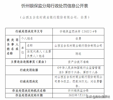 7月19日,据忻州银保监分局披露的行政处罚信息公开表显示,山西五台农村商业银行股份有限公司资产分类不准确,忻州银保监分局依据《中华人民共和国银行业监督管理法》第四十六条、第四十八条,于2022年7月15日对其责令改正,罚款30万元;对白勇警告。该行法定代表人(主要负责人)姓名为陈旺。