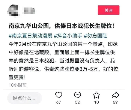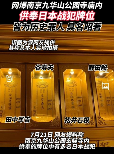 另据此前网友爆料称,位于南京九华山公园里面的玄奘寺,供奉着四名日军战犯的长生牌位,供奉人署名为“吴啊萍”,该消息随即在网上引发网民愤怒。