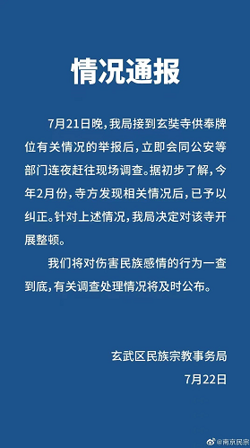 7月22日,南京市民族宗教事务局官方微博(@南京民宗)发布情况通报,关于玄奘寺供奉牌位有关情况,玄武区民族宗教事务局通报如下: