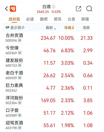 古井贡酒涨停也带动了白酒板块活跃,截至收盘,今世缘涨近7%,洋河股份、建发股份、老白干酒等涨超2%。