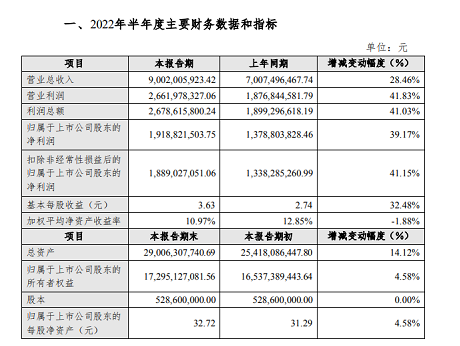 古井贡酒7月29日晚间披露2022年半年度业绩快报,报告期内,公司实现营业总收入90.02亿元,较上年同期增长28.46%;营业利润26.62亿元,较上年同期增长41.83%;利润总额26.79亿元,较上年同期增长41.03%;归属于上市公司股东的净利润19.19亿元,较上年同期增长39.17%。