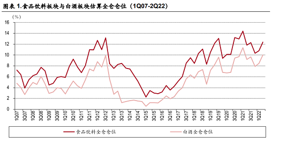 而卖方研究显示,今年二季度基金重仓食品饮料比例环比上升,基金重仓食品饮料股票市值占基金投资股票总市值的8.46%,环比+1.08pct,其中基金重仓白酒、其他酒类和非酒类食品股票市值分别占基金投资股票总市值的7.31%、0.26%和0.88%。