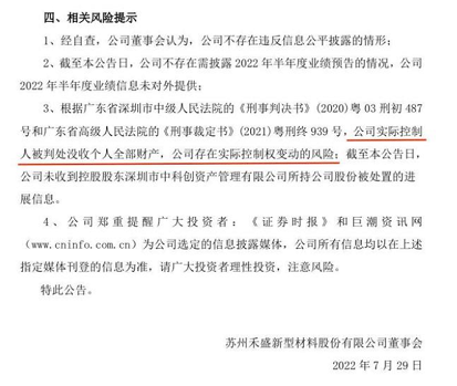 禾盛新材7月31日晚间发布股票交易异常波动公告称,根据深圳市中级人民法院的《刑事判决书》和广东省高级人民法院的《刑事裁定书》,公司实际控制人被判处没收个人全部财产,公司存在实际控制权变动的风险。