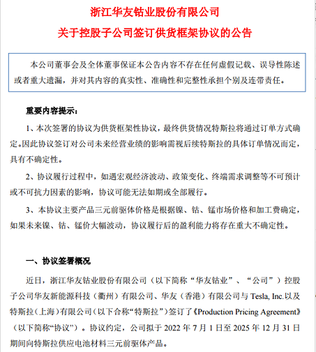 昨晚,华友钴业公告称,控股子公司与特斯拉签订供货框架性协议,公司拟于2022年7月1日至2025年12月31日期间向特斯拉供应电池材料三元前驱体产品。