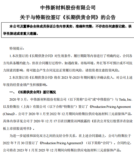 中伟股份也在昨晚发布公告称,公司与特斯拉于2022年7月30日签订合同,将于2023年1月至2025年12月期间向特斯拉供应电池材料三元前驱体产品。