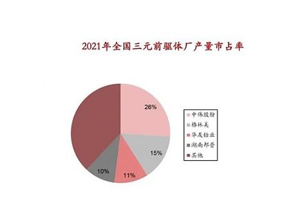 而上述中伟股份和华友钴业均为国内三元前驱体的龙头企业。据招商证券统计,2021年国内三元前驱体行业仍然维持较高集中度,龙头企业中伟股份一骑绝尘,市占率达到26%,位列行业第一,与紧随其后的格林美、华友钴业和湖南邦普,四者在制备工艺、原料资源、客户绑定等方面均具备明显优势,产量CR4集中度高达62%。