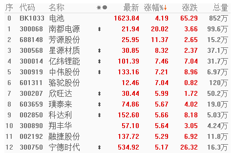 尤其电池行业,指数今天大涨4.19%,居行业之首。南都电源20CM涨停,万亿巨头宁德时代大涨5.17%。亿纬锂能、欣旺达、璞泰来等也涨幅居前。