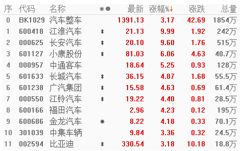 汽车整车今天大涨3.17%,板块中江淮汽车涨停,长安汽车、小康股份和中通客车涨超5%,比亚迪上涨3.18%。