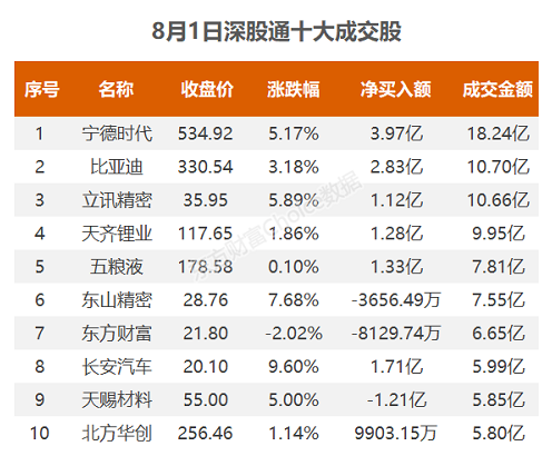 交易所公布的沪深港通十大成交股显示,今日北上资金大幅净买入宁德时代3.97亿元,净买入比亚迪2.83亿元,净买入华友钴业2.89亿元,同时大幅净卖出贵州茅台1.96亿元。