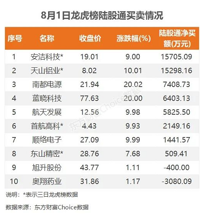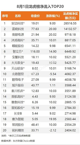 8月1日,上榜龙虎榜个股中,资金净流入最多的是安洁科技,三日净流入2.65亿元。数据显示,该股日内大涨9%,近三日累涨25.07%。资金净流入居前的深股通席位三日净买入1.57亿元,中金上海分公司三日净买入1883.89万元。