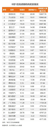机构参与龙虎榜中个股共涉及33股,其中22股被机构净买入,蓝晓科技被买入最多,为1.38亿元。另外11股被机构净卖出,安洁科技被卖出最多,三日净卖出8171.95万元。