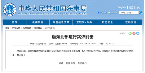 据辽宁海事局消息,渤海北部,自8月1日1400时至8月4日2400时将在以39-50.80N 121-10.03E为中心,8海里为半径范围内进行实弹射击。禁止驶入。
