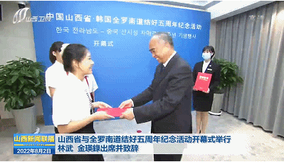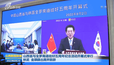 8月2日上午,山西省与韩国全罗南道结好五周年纪念活动开幕式以视频方式在两地会场同步举行。省委书记、省人大常委会主任林武,全罗南道知事金瑛錄,中国驻光州总领事张承刚出席并致辞,韩国驻华大使馆参赞金相广作视频致辞。省委常委、常务副省长张吉福主持开幕式。省委常委、秘书长李凤岐,全罗南道国际关系大使朴泳植出席。