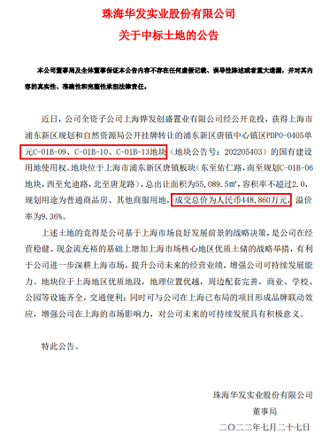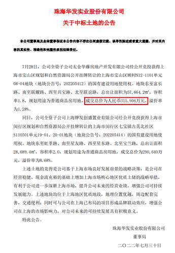 上面是华发股份发布的两份公告,土拍中华发一共拿了四块地,耗资超过75亿元。