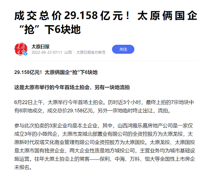 比如太原最近一次土拍,6块地都卖给了本地国企,没有外部国企拿地。