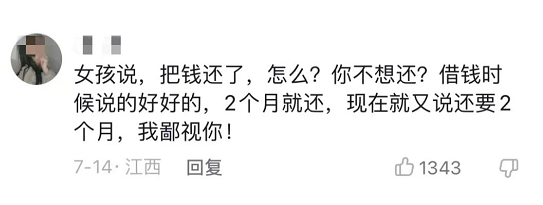 借钱的时候说得好好的,2个月就还,现在又说还要2个月,我鄙视你!”