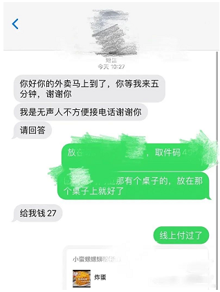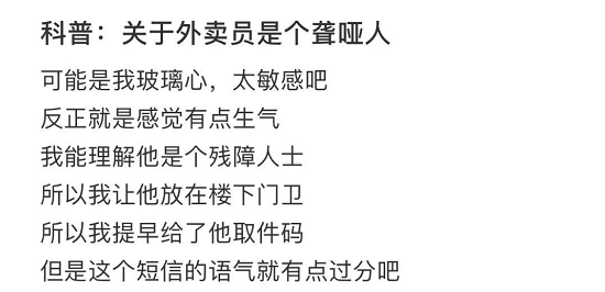小某书上最近有个热帖,一个小姐姐称自己收到了聋哑人外卖员的短信,短信的语气让她有点生气。