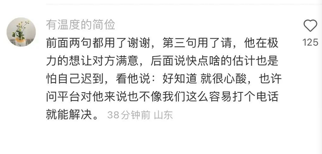 “前面两句都用了谢谢,第三句用了请,他在极力地想让对方满意,后面说快点啥的估计也是怕自己迟到。