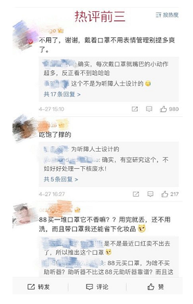 然而,热评的前三,却都是在说发明这种口罩的人是“吃饱了撑的”,嘲讽这种口罩又贵又没用。