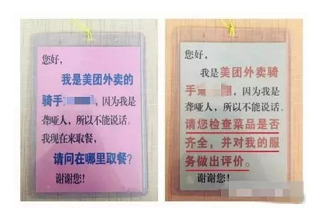 那位聋哑的外卖小哥,向顾客出示的并不是什么讨钱的残疾证,而是公司专门为他制作的工作牌。