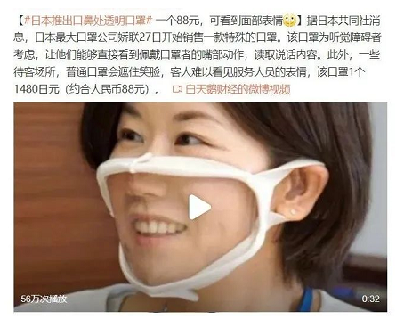 日本就推出了一款透明的口罩,但是有点贵,一个要88元人民币。