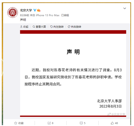 近期,我校对陈春花老师的有关情况进行了调查。8月3日,我校国家发展研究院收到了陈春花老师的辞职申请。学校按程序终止其聘用合同。