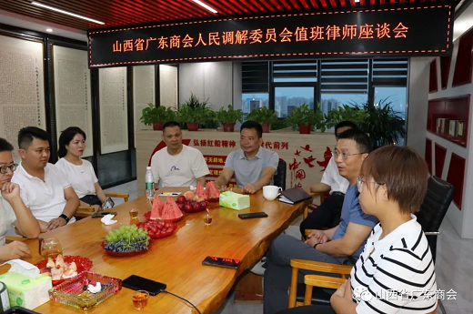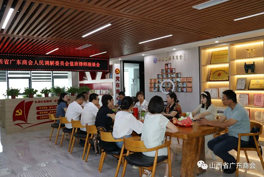 2022年8月2日下午,山西省广东商会(晋商俱乐部联合发起机构)调委会在商会召开值班律师座谈会,商会会长、广调委主任曾建新,广调委副主任、北京大成(太原)律师事务所高级合伙人张小雨,广调委副主任、商会副会长苏丽平,轮值会长朱文河、秘书长马飞跃,调解进律所负责人韩飞,调解进物业负责人王凯,调解进企业负责人徐德峰,讲师团负责人马少君,涉外组负责人王梦娇,网宣处负责人花晓婧,调解员值班律师袁晓婷、常卿、李爱爱、禇清清,我会理事胡俊英、黄俊良参加座谈会。会议由副主任苏丽平主持。