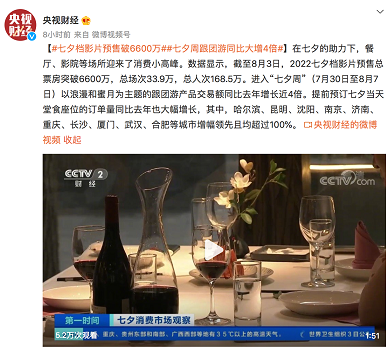 8月4日消息,在七夕的助力下,餐厅、影院等场所迎来了消费小高峰。数据显示,截至8月3日,2022七夕档影片预售总票房突破6600万元,总场次33.9万,总人次168.5万。进入“七夕周”(7月30日至8月7日)以浪漫和蜜月为主题的跟团游产品交易额同比去年增长近4倍。提前预订七夕当天堂食座位的订单量同比去年也大幅增长,其中,哈尔滨、昆明、沈阳、南京、济南、重庆、长沙、厦门、武汉、合肥等城市增幅领先且均超过100%。(央视财经)
