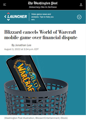 8月4日消息,据外媒援引知情人士称,动视暴雪与网易公司终止合作开发《魔兽世界》手游,原因是两家公司在财务问题上存在争论。