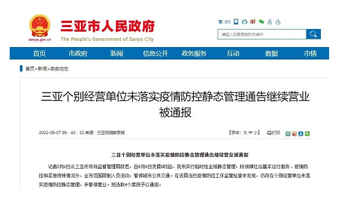 据三亚市市场监督管理局6日消息,自8月6日凌晨6时起,三亚市实行临时性全域静态管理,除保障社会基本运行服务、疫情防控和紧急特殊情况外,全市范围限制人员流动,暂停城市公共交通。在该局当日疫情防控工作监管检查中发现,仍存在个别经营单位未落实疫情防控静态管理,未暂停营业。