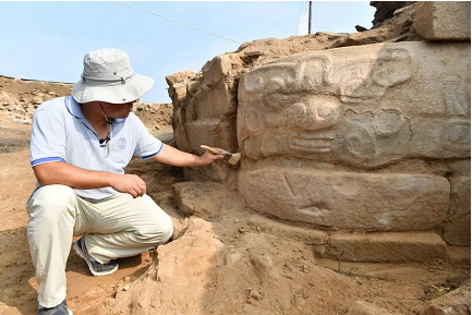考古工作者正在对石雕进行发掘清理。新华社记者 张博文 摄