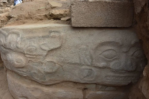 目前这件石雕已发掘出两个相邻的人面浮雕,两个人面保存状况较好,神态庄严肃穆,均戴有耳珰,呈现双目略突出、阔嘴呲牙的表情,其中西侧人面长约80厘米、高约50厘米,头戴冠饰,是石峁石雕中尺寸最大的单体图像。东侧人面双眼外侧有弧状纹饰。