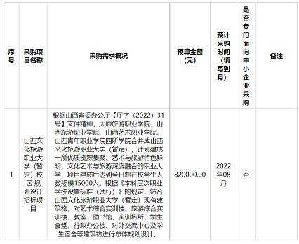 近日,《山西文化旅游职业大学(暂定)校区规划设计招标项目2022年7月至8月政府采购意向》在山西政府采购网发布。