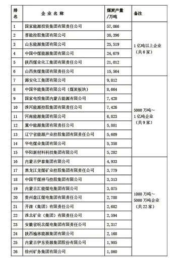 2022中国煤炭企业煤炭产量千万吨以上企业名单