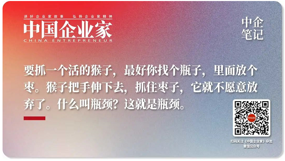 还有一个故事。吕鸿德说要抓一个活的猴子,最好你找个瓶子,里面放个枣。猴子把手伸下去,抓住枣子,它就不愿意放弃了。什么叫瓶颈?这就是瓶颈。其实一放弃就能出来,但猴子就不愿意放弃,人比猴子聪明应该放弃,但其实也不比猴子好多少,一般抓住的东西不会放弃,明明旁边有苹果有香蕉,可抓了个枣子就不愿意放弃。