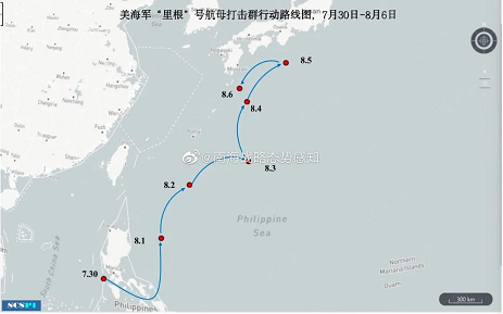 “里根”号在佩洛西窜访到解放军联合大演习期间的动向,图片来源:南海战略态势感知