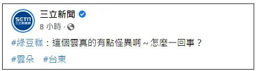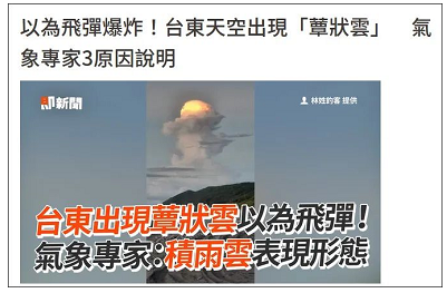 报道称,林先生把照片发布到facebook上后,其评论区也呈现出风声鹤唳的气氛,“核弹爆炸吗”、“东风导弹打来了”、“100%有够像核爆的啦”。