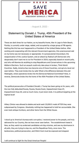 在声明中,特朗普认为这是美国的“黑暗时代”,历任总统从未经历过类似的事情,FBI甚至撬开了他的保险柜,这无异于“水门事件”。他表示,自己本已与有关部门合作配合其调查,这次搜查“既没有必要也不合适”,表明了“极左民主党”利用司法武器企图阻止他参与2024大选。
