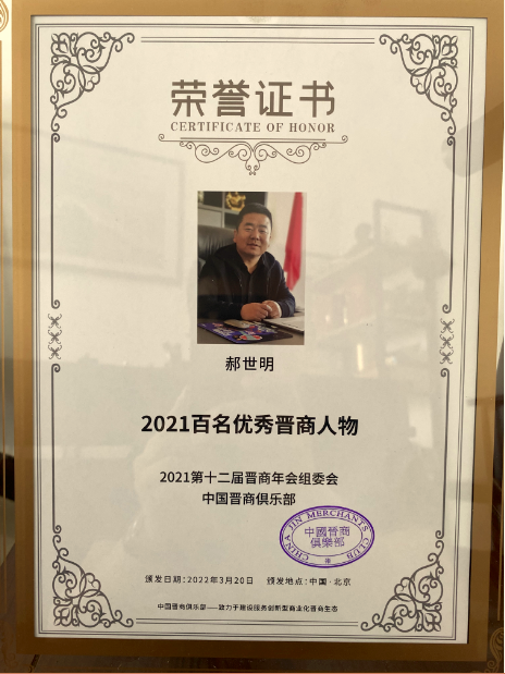 2022年8月9日,受2021第十二届晋商年会组委会、中国晋商俱乐部秘书处委托,晋商俱乐部秘书长刘文斌向2021百名优秀晋商人物、忻州市尚晋家居有限公司董事长郝世明颁发了荣誉奖牌。