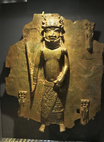 “青铜牌匾上刻画的是奥巴奥霍布阿,他手中的权杖象征着权威与权力。他穿着带有褶皱和繁复刺绣的外衣,系着带有流苏的腰带,身体上画着皇家纹身(Iwu),这是贝宁公民身份的标志。”