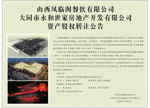 其表示,近年来,由于受投资规模以及市场环境因素影响,公司的银行贷款及其他到期债务很难及时清偿,给债权人带来了一定的影响,对此,我们深表歉意。为了维护企业声誉以及债权人利益,我公司郑重决定:自本公告之日起,对山西凤临阁餐饮有限公司及大同市永和世家房地产开发有限公司名下全部资产(包括凤临阁酒楼、凤临阁休闲文化街及所有无形资产)和股权进行整体转让。凡具备雄厚资金实力,且对凤临阁这一百年老店足够珍惜热爱并立志传承的知名企业和有识之士均可协商洽谈。届时我们真诚希望能够得到相关债权人理解和配合。