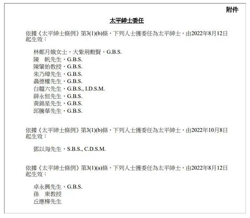 据香港特区政府网站8月12日消息,香港政府今日(8月12日)于宪报刊登太平绅士委任名单。
