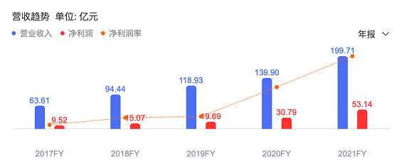 从财报来看,过去5年,汾酒年营收从63.61亿元增长到199.71亿元,净利润从9.52亿元增长至53.14亿元。