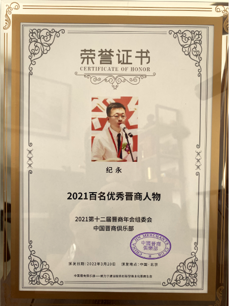 2022年8月22日,受2021第十二届晋商年会组委会、中国晋商俱乐部秘书处委托,河北省山西商会向2021百名优秀晋商人物、山河零售连锁有限责任公司董事长纪永颁发了荣誉奖牌。