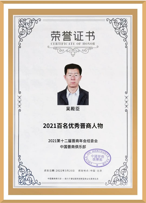 2022年8月22日,受2021第十二届晋商年会组委会、中国晋商俱乐部秘书处委托,河北省山西商会向2021百名优秀晋商人物、河北九泓国泰工程项目管理有限公司总经理吴殿臣颁发了荣誉奖牌。