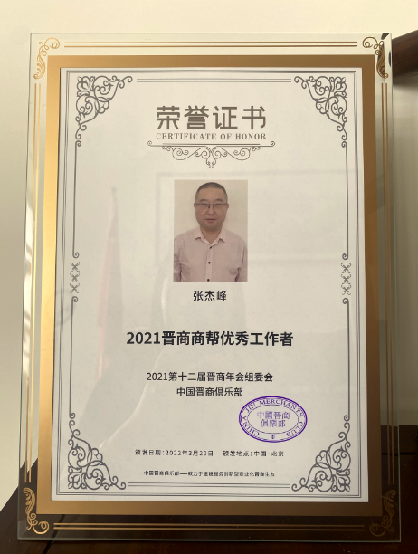 2022年8月22日,受2021第十二届晋商年会组委会、中国晋商俱乐部秘书处委托,河北省山西商会向2021晋商商帮优秀工作者、河北省山西商会副会长张杰峰颁发了荣誉奖牌。