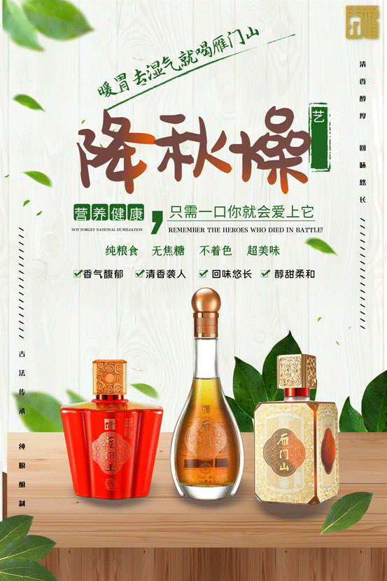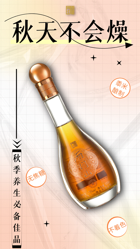除此之外,秋天也是滋补的好时机,雁门山黄酒暖胃去湿气,在炎炎夏日后,身体空亏时——纯粮食酿制的雁门山黄酒,富含多种人体所需的氨基酸,黄酒中已检出的无机盐达18 种,包括钙、镁、钾、磷、铁、锌、等。黄酒中的维生素B、E 的含量也很丰富,主要来自原料和酵母自溶物。可以在秋天为人体补充所需营养元素。