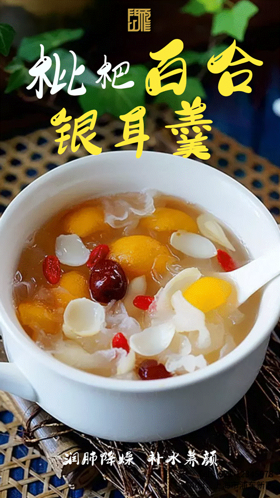 枇杷百合银耳羹。百合可养阴润肺、清心除烦,枇杷、银耳都是滋阴润肺的天然食材,搭配食用,可增强养肺阴的作用。此羹适合肺热、肺燥咳嗽、津干口渴、心胸烦闷、肠燥便秘者,秋季食用有保护呼吸道、缓解秋燥、防病抗病的保健作用。