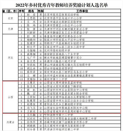 8月31日,教育部网站公示2022年乡村优秀青年教师培养奖励计划人选名单,在入选的300名教师中,山西太原市清徐县孟封学校王慧芝等9名教师榜上有名。